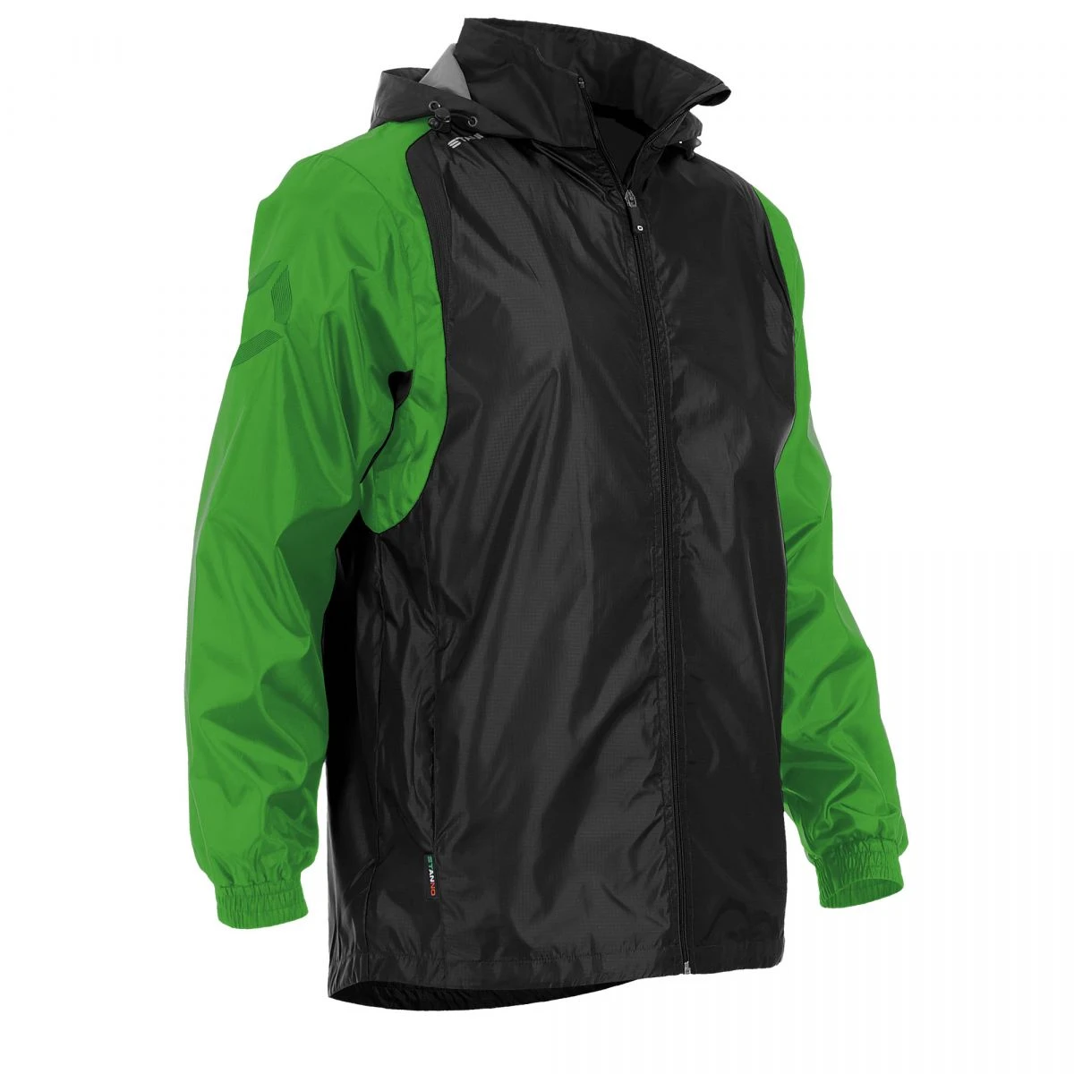 This windbreaker (100% polyester ripstop) is finished with a special coating and mesh lining that make the jacket water repellent and protect you from cold wind. The jacket protects you in inclement weather conditions with an elastic cord in the cuffs and hem, a windbreaker behind the zip and a comfortable high collar. It also contains a hidden hood. The windbreaker is the ideal jacket for a long day on the sidelines!