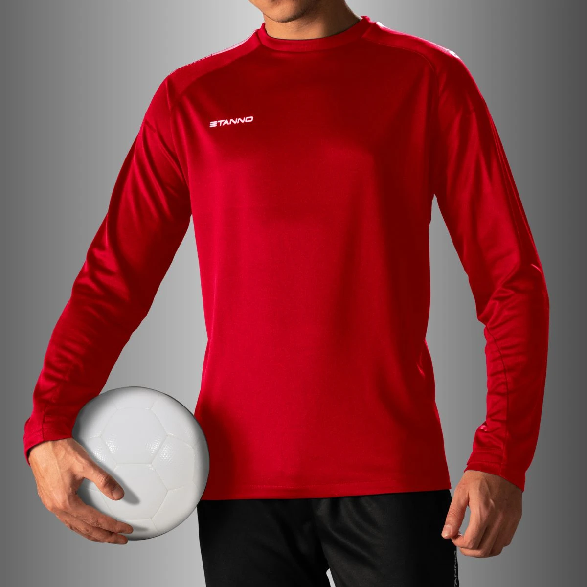 This top from Stanno is made from 100% recycled polyester. The round neck is made of soft rib material. You wear this top before or after exercise or during your warm-up and cool down so that your muscles stay warm. The top has mesh panels, and a raglan sleeve insert ensures that you have sufficient freedom of movement. Another nice thing about this top is the thumbholes for a comfortable feeling. The printed Stanno logos complete this top. The top is suitable for team sports and presentation.