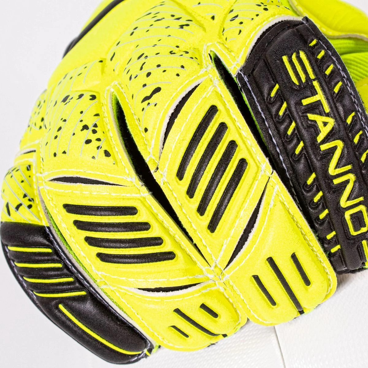 This glove contains soft foam, for a reliable grip and comfortable cushioning. With finger protection: flexible, hard ribs ensure optimal protection of the fingers. The flat hand, positively stitched, increases the foam surface and makes it easier to stop the ball. The neoprene insert on the upper provides a perfect and flexible fit, the fingers have an elastic mesh/nylon insert. The elastic strap closure protects the wrist and the woven wristband provides extra strength.