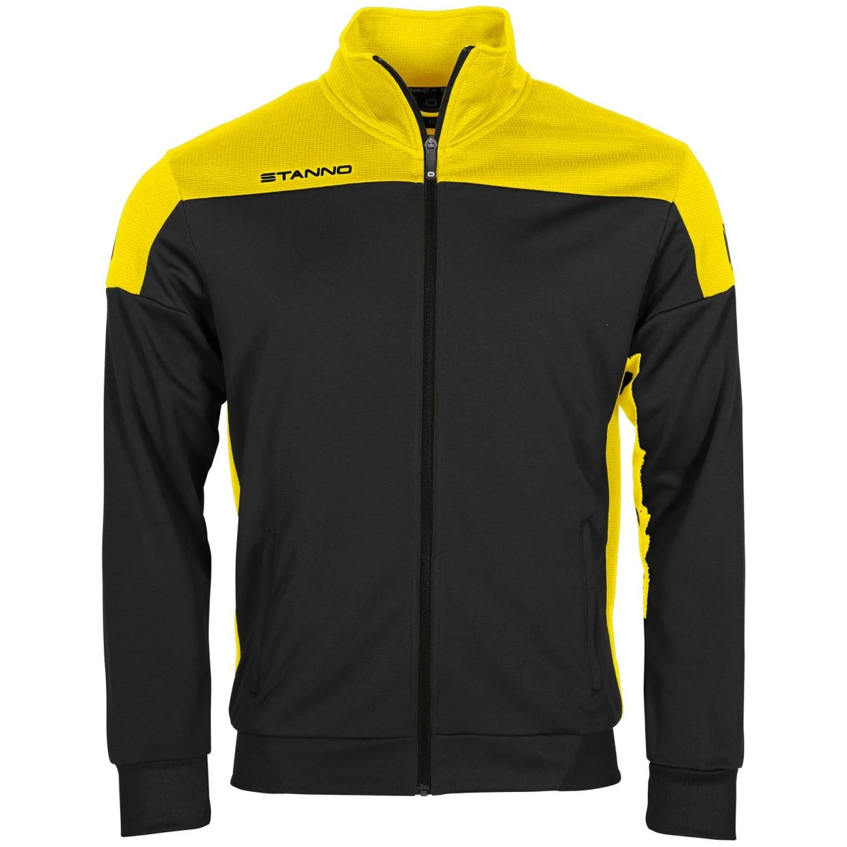This stylish jacket, part of the Stanno Pride collection, is comfortable to wear before and after exercise or during your warm up. The jacket has two slit pockets on the front and connecting machets of elastic rib material. The top and sides are made of ventilating mesh that feels light and airy. The waist is also finished with an elastic rib material, which ensures an optimal fit.